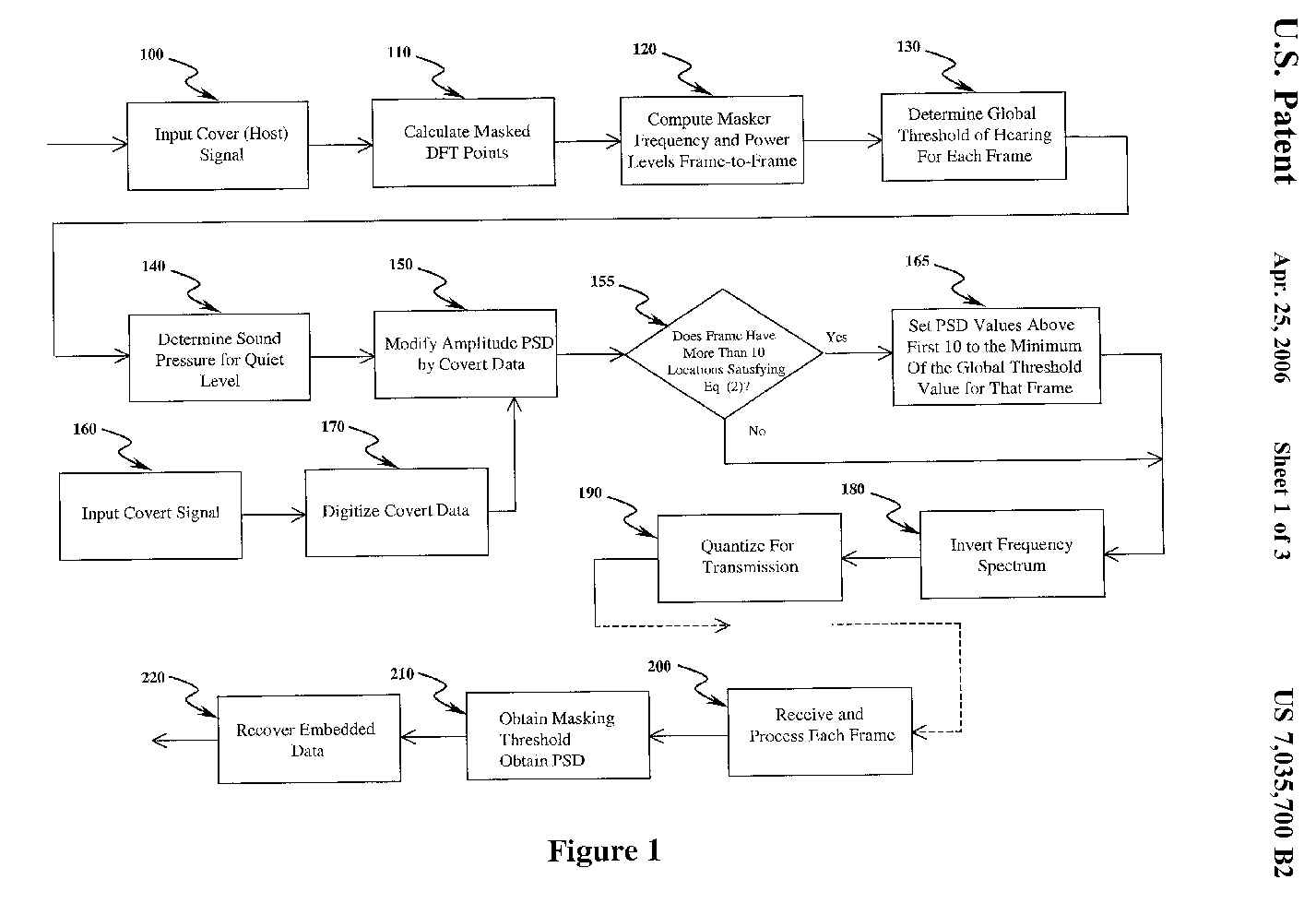 Gopalan, K.G. et. al. Data Embedding In Audio Signals. Aerospace Conference, 2001, IEEE Proceedings. vol. 6, Publication Date Mar. 10-17,2001, pp. 2713-2720. cited by examiner . Garcia, Richard A. digital Watermarking of Audio Signals Using a Psychoacoustic Auditory Model and Spread Spectrum Theory. University of Miami, Apr. 21, 1999. cited by examiner . Tilki, John F. et al. Encoding a Hidden Auxiliary Channel Onto a Digital Audio Signal Using Psychoacoustic Masking. 1997. cited by examiner . Cvejic, Nedelijko et al. Audio Watermarking Using m-Sequences and Temporal Masking. Applications of Signal Processing to Audio and Acoustics. Oct. 2001, pp. 227-230. cited by examiner . Bassia, Paraskevi et al. Robust Audio Watermarkingi in the Time Domain. IEEE Transactions on Multimedia. vol. 3, No. 2, Jun. 2001. cited by exami- ner . Swanson, Michelle D. et al. Multimedia Data-Embedding and Watermarking Technologies. Proceedings of the IEEE, vol. 86, No. 6, Jun. 1998, pp. 1064-1087. cited by examiner . Anderson, Ross L. et al. On the Limits of Stenography. IEEE Journal on Selected Areas in Communication. vol. 16, No. 4, May 1998. vol. 16, No. 4, pp. 474-481. cited by examiner . Boney, Lawrence et al. Digital Watermarks for Audio Signals. Multimedia Computing Systems, 1996, Prcoeedings of the 3rd IEEE International Conference on Multimedia. pp. 473-480. cited by examiner. |