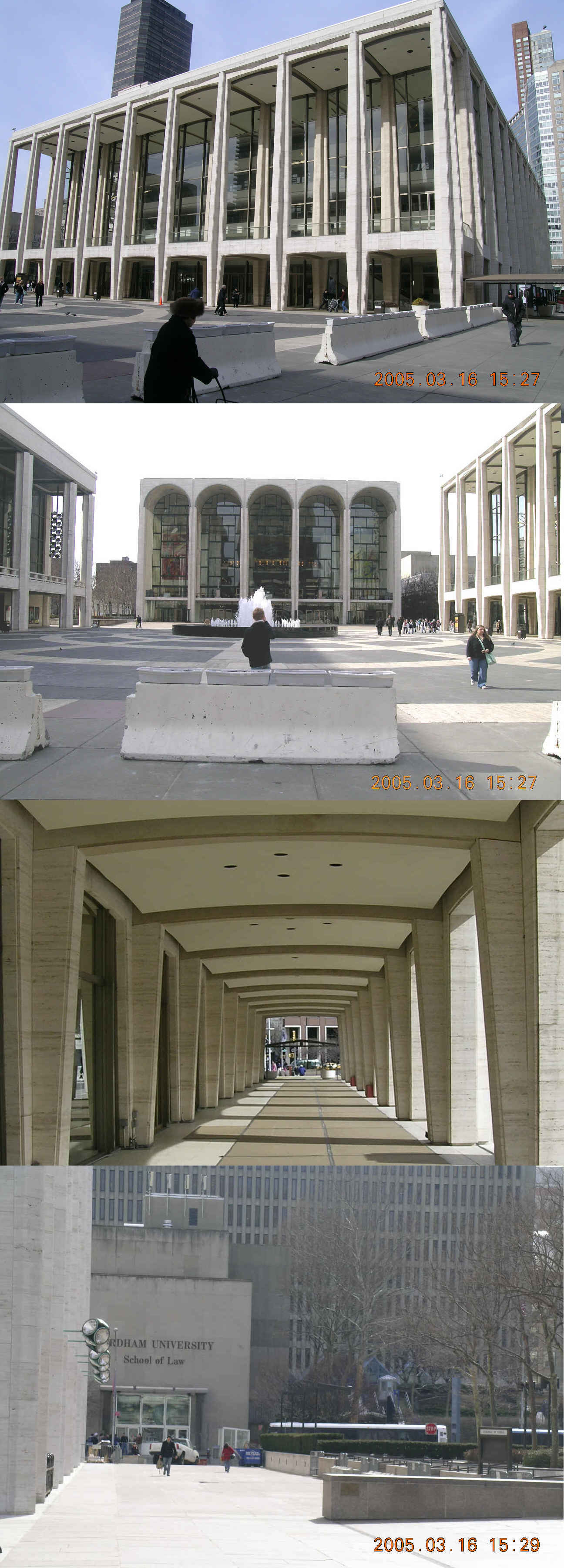 Lincoln CenterPerhaps security is beefed up when thousands of New York's swellest attend evening performances, but the installation of heavy concrete barriers is vulnerable at their mid-point where a half-barrier has been located, perhaps to allow access for outdoor performances or to allow easier movement to and from long lines of limousines and taxis at performance times. Widely-placed planters at the arcade entrance present no obstacle to vehicular attack. On the side of the complex only a lightweight pick-up is used to partially block direct access to the central court of the three main performance buildings. A huge parking garage underlies the entire complex with lightly-staffed entrances on three surrounding streets. |