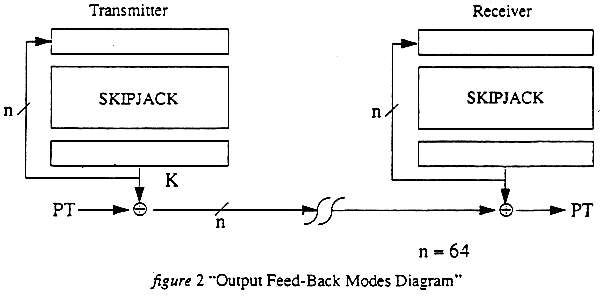 Note that the OFB and CFB modes of operation have been limited. This was an efficiency/memory trade-off that was made in order to conserve IC memory while providing a reasonable range of encryption rates. The modes are described in the following diagrams: