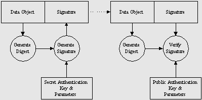 A digital signature allows an entity to 'sign' a data object in a way that cannot be easily forged. In this case a signature is generated by first computing a hash or digest of the data object, then enciphering the result using a secret authentication key that is only known to the entity carrying out the signing. Any entity can then verify the authenticity of the data object using the associated public authentication key and parameters. The entity generates a new digest from the data object and uses this, together with the public authentication key and parameters to verify the signature.