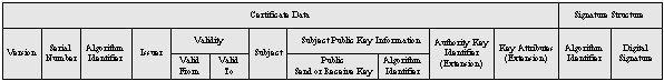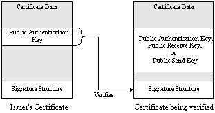The public authentication keys are held within authentication certificates. The certificates are encoded structures (Section 4.2) based upon version three of the X.509 certificate and selected extensions (See [509], [509a] and [509b]). The secret authentication keys are also held within encoded structures, known as secret key tokens. The keys within the tokens may be enciphered with a user code which is distributed to the user via a different channel to the tokens themselves.