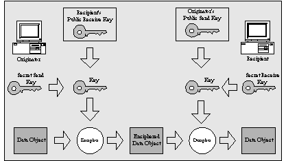 An entity (person or process) within the framework is allocated a public send key and a secret send key as the basis for enciphering data, and a public receive key and a secret receive key as the basis for deciphering data. This implementation differs from the more conventional implementations of the Diffie-Hellman protocol which allocates a single pair of keys. A data object is enciphered with a key generated from the originator's secret send key and the recipient's public receive key, and is deciphered with the same key but generated from the originator's public send key and recipient's secret receive key. For the scheme to operate successfully all keys used in the process must be based upon the same parameters (modulus and base value). For efficiency the generated key is not used to encipher the data object directly. Instead the data object is enciphered with a data key which is placed inside a 'token'. It is the token which is enciphered with the Diffie-Hellman derived key or Token Key (TK). The data object is only enciphered once, whereas the data key may be enciphered a number of times depending on the number of recipients.