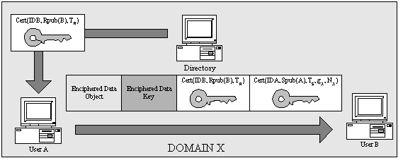 If User A (IDA) needs to exchange enciphered data objects with User B (IDB) in the same domain (Domain X), they are each allocated the following by Certificate Management Authority X. Item (a) is distributed to each user through a secure channel, item (b) may be distributed to users or posted in the domain's directory, item (c) is only posted in the directory. The initial distribution of secret key tokens is outside the scope of this paper, however subsequent distributions may use the electronic mail system and the confidentiality service provided by the security protocol.