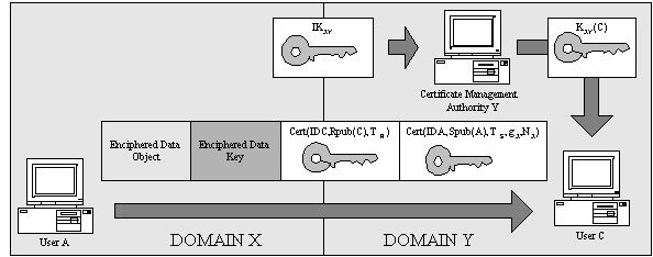 If User A needs to exchange enciphered data objects with User C (IDC) in a different domain (Domain Y), the receive certificate of User C will not be available - unless User C has already received enciphered data objects from a user within the first domain. In this case User A passes User C's distinguished name to Certificate Management Authority X which deterministically generates a public receive key for User C, by the following processing.