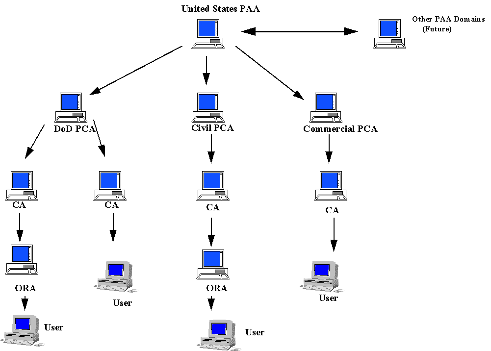 Each domain is composed of a hierarchy of authorities that perform different functions. (See Figure 2-1) These authorities include the Policy Approving Authority (PAA), Policy Creation Authority (PCA), Certification Authority (CA), and Organizational Registration Authority (ORA), as defined below. Most of the day-to-day operations of the Certification Authority Workstation (CAW) (key/certificate generation, FORTEZZA card programming, FORTEZZA card and PIN distribution, etc.) are performed by a single operator, the CA and/or the ORA.