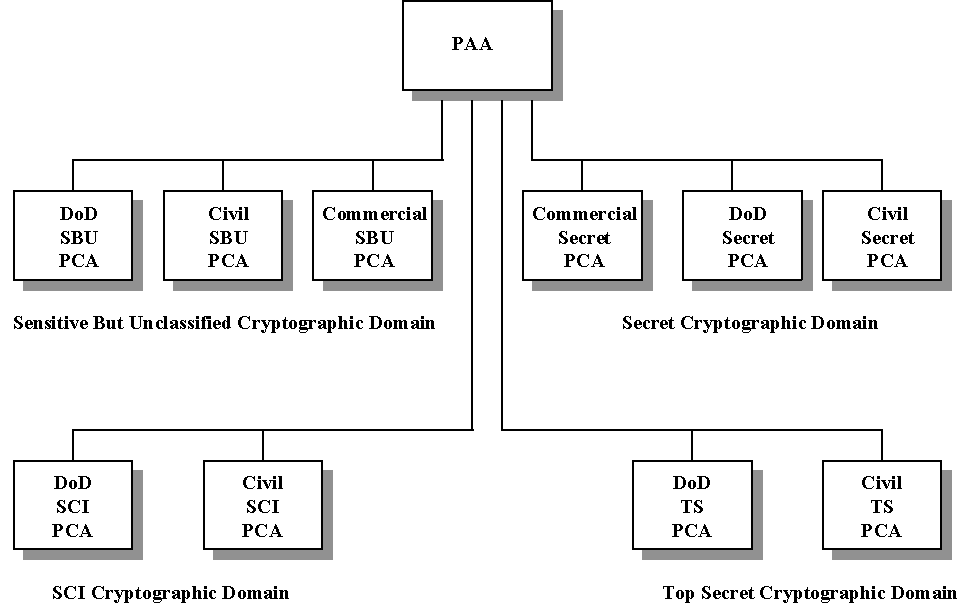 A PCA is the administrative root for the security policy of its domain, such as the DoD. Multiple PCAs may exist within a single cryptographic domain. This means, all CAs and end users under those PCAs can communicate, since they use the same cryptographic algorithms and parameters.