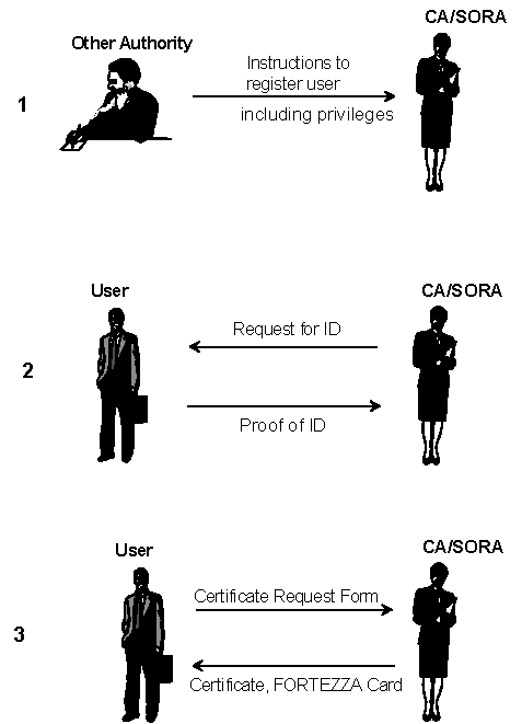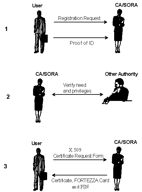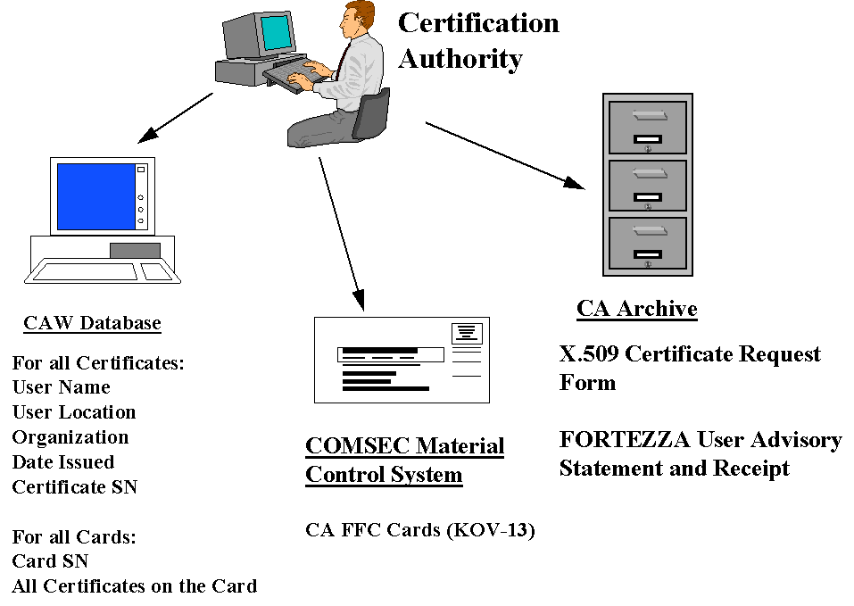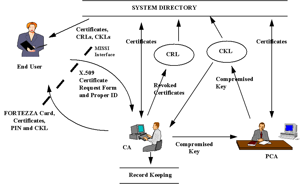 A CA is the MISSI administrative authority for an autonomous organization, or major unit of an organization, under a PCA's domain. A CA registers end users and issues their certificates. This includes initializing and loading the end users' FORTEZZA cards, and entering the end users' certificates in the directory (DSA). Periodically, a CA issues a CRL. The CA must distribute all the CKLs that it receives from the PCA, to the end users.