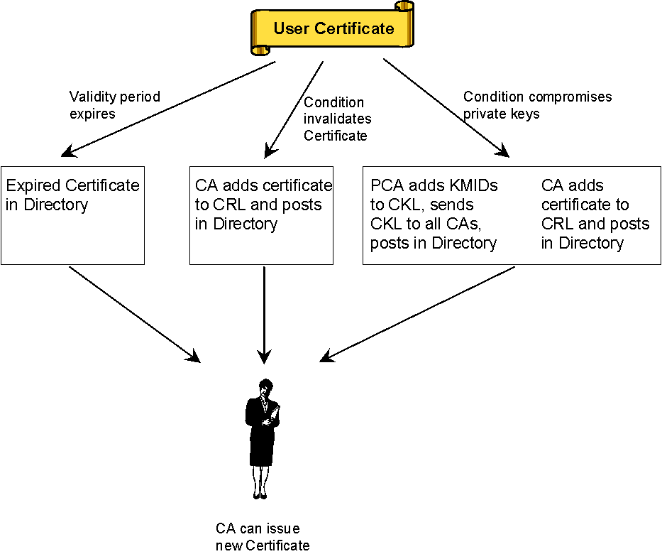Private keys may be compromised, rendering them invalid. When this occurs, the PCA under which the compromised key was issued, is notified. Then, the PCA adds the KMID for the key to the CKL. The PCA pushes the CKL to each of its subordinate CAs by the most expeditious means (e.g., e-mail). Then, the CAs expeditiously pushes the CKL to each of their end users. The CKL is also posted in the directory (DSA). Whenever a key is placed on a CKL, the corresponding certificate is revoked via a CRL. The CA must generate and electronically post the CRL.