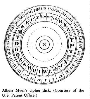 While a number of banner exchanges succeeded, others were intercepted by experienced observers on both sides. Always security conscious, Albert Myer applied for a patent for a CIPHER DISK intended to accompany the wig-wag system. The disk used only the numerals 1 and 8 in various combinations on its outer ring and a randomly placed alphabet on its movable inner ring. Myer specified that those exchanging messages each have one of his disks and a prearranged plan to coordinate it with the flags or other visual signals. His goal was to give better protection to the observable aspects of a system like wigwag by sending signals with numbers that could only be decrypted with the disks.