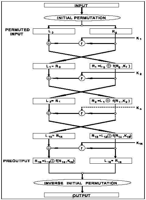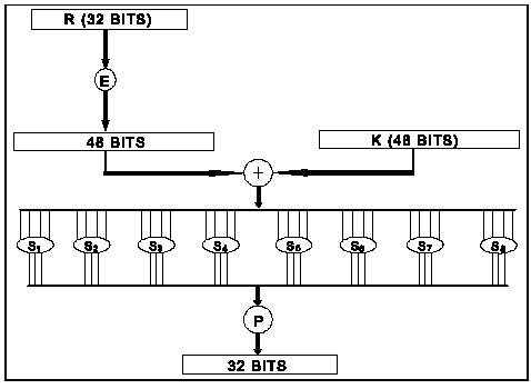 Thus K (+) E(R) is first divided into the 8 blocks as indicated in (6). Then each Bi is taken as an input to Si and the 8 blocks S1(B1),S2(B2)...S8(B8) of 4 bits each are consolidated into a single block of 32 bits which forms the input to P. The output (7) is then the output of the function f for the inputs R and K.