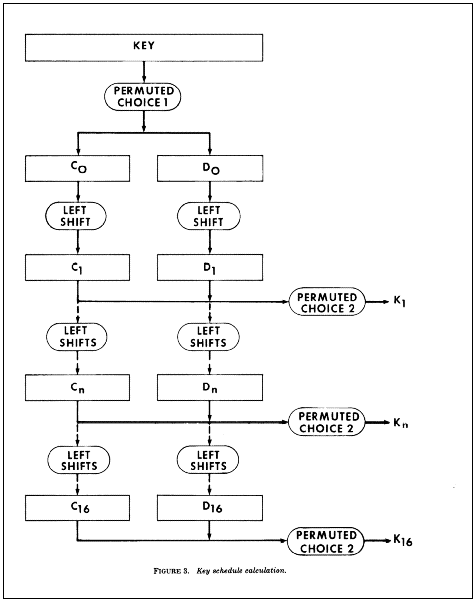 Recall that Kn, for 1<n<16, is the block of 48 bits in (2) of the algorithm. Hence, to describe KS, it is sufficient to describe the calculation of Kn from KEY for n = 1, 2,..., 16. That calculation is illustrated in Figure 3. To complete the definition of KS it is therefore sufficient to describe the two