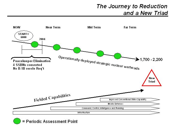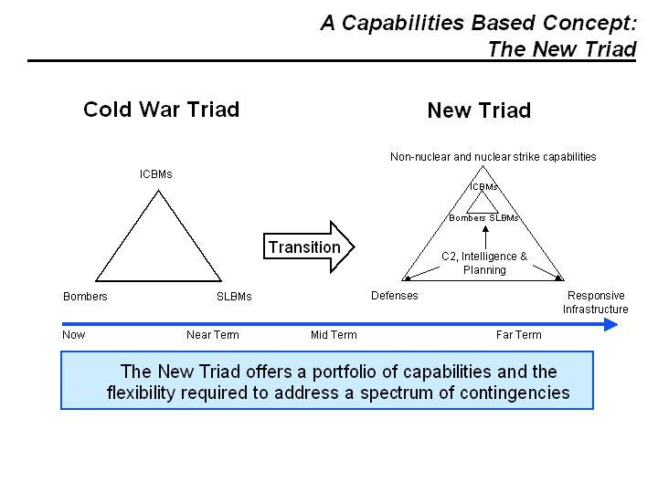 I'll let you stare at this for a second. This is a pictogram that is designed to kind of tell you where we are and where we want to be. And there's a transition that's going to go on here; it's not something that's going to happen overnight. Our strategic forces today continue to be arrayed around a triad that looks very much like it did during the Cold War: ICBMs [intercontinental ballistic missiles], bombers and SLBMs [submarine-launched ballistic missiles]. We would like to transition to what we call a new triad, a triad of forces that includes non-nuclear and nuclear strike capabilities, and notice that the smaller triad is, in fact, embedded in this. We will continue to maintain a balanced nuclear force triad, but at a much smaller or reduced level.