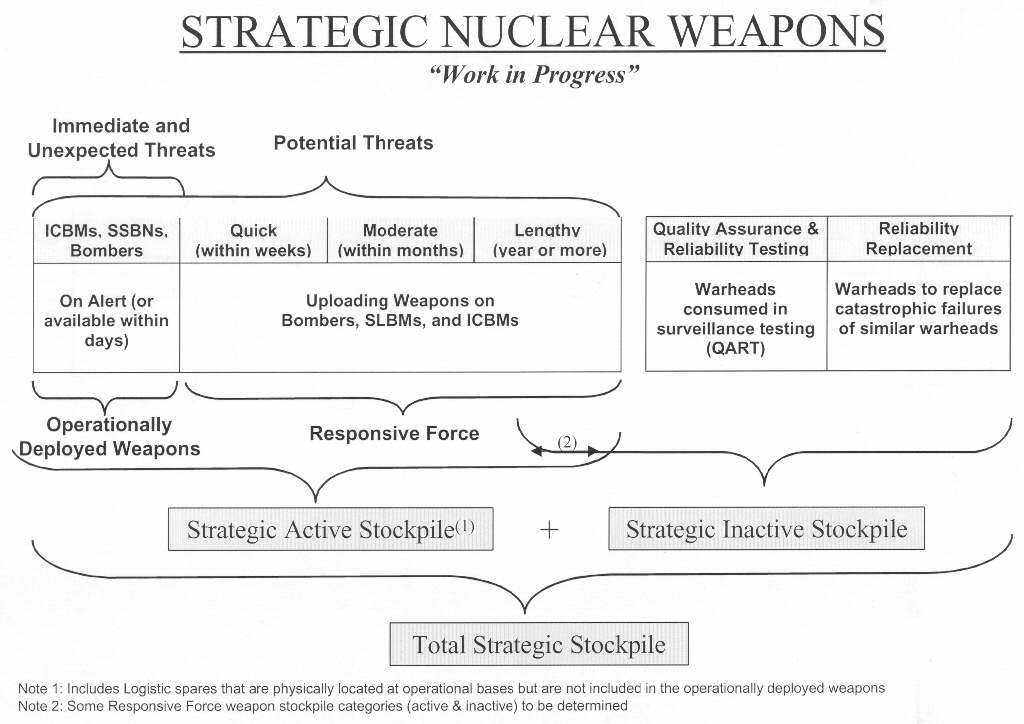 Although the NPR did not determine specific stockpile quantities or readiness requirements, it did introduce to the stockpile lexicon the categories operationally-deployed and responsive. Operationally-deployed warheads are warheads fully ready for use and either mated on, or allocated to, operational delivery systems; these warheads are part of the active stockpile.3 Responsive warheads are warheads available to be uploaded to delivery systems in the event that world events require a more robust deterrence posture; most or all of these warheads would also be part of the active stockpile.