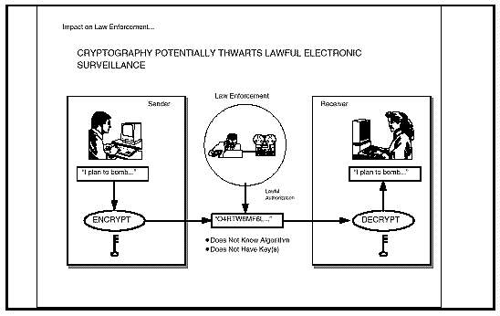 EXECUTIVE SUMMARY Encryption is extremely beneficial when used legitimately to protect commercially sensitive information and communications. The law enforcement community, both domestically and abroad, is extremely concerned about the serious threat posed by the proliferation and use of robust encryption products that do not allow for the immediate, lawful access to the plaintext of encrypted, criminally-related communications and electronically stored data in accordance with strict legal requirements and procedures. The potential use of such commercially-available encryption products by a vast array of criminals and terrorists to conceal their criminal communications and information poses an extremely serious threat to public safety and national security. Law enforcement fully supports a balanced encryption policy that satisfies both the commercial needs of industry for robust encryption while at the same time satisfying law enforcement's public safety and national security needs. Robust, commercially- available encryption products, which include some type of recoverable capability that allows for immediate, lawful access to plaintext is clearly the best method to achieve the goals of both industry and law enforcement. Since April of 1993, the Clinton Administration has expressed support for the adoption of a balanced encryption policy. In lieu of legislation, the Clinton Administration continues to favor a voluntary approach to address law enforcement's public safety concerns regarding encryption for domestic use. The Administration has been attempting to work with industry, through "good faith dialogue," and by allowing "market forces," influence and inducements (mainly changes to existing export regulations) to bring about the development, sale and use of recoverable encryption products within the U.S. During the 105th Congress, several encryption-related bills were introduced; however, none were enacted. The main focus of these bills was the relaxation of existing export controls on encryption, regardless of the impact on national security and foreign policy. During the 106th Congress, three encryption-related bills have been introduced. Like last Congress' encryption related bills, the main focus of these bills is to either relax existing export controls on encryption products and/or prevent the government (federal or state) from imposing domestic requirements on encryption products to ensure that such domestic encryption products include some type of plaintext access for law enforcement should these products be used in the furtherance of serious criminal activity. These bills included: H.R.850, S.798, and S.854. THE PROLIFERATION OF SECURE OR ENCRYPTED COMMUNICATIONS AND ELECTRONICALLY STORED INFORMATION WILL MAKE IT INCREASINGLY DIFFICULT FOR LAW ENFORCEMENT TO OBTAIN AND DECIPHER THE ENCRYPTED CONTENT OF LAWFULLY INTERCEPTED COMMUNICATIONS AND LAWFULLY OBTAINED ELECTRONICALLY STORED INFORMATION THAT IS NECESSARY TO PROVIDE FOR EFFECTIVE LAW ENFORCEMENT, PUBLIC SAFETY, AND NATIONAL SECURITY. WHAT IS ENCRYPTION? Encryption is the method of hiding the content of a message. In broad terms, any system or technique that renders a message unintelligible by anyone other than the intended recipient of the message is utilizing encryption. A message which has not been encrypted is often referred to as "plaintext". After a message has been encrypted, it is referred to as "ciphertext". Whereas encryption is used to secure a message, decryption is the method for converting ciphertext back to its original plaintext. Many encryption systems use a mathematical function, known as a cryptographic algorithm, to encrypt and decrypt messages. Just as a lock box requires a key to lock or unlock it, a cryptographic algorithm requires a key to encrypt and decrypt a message.
