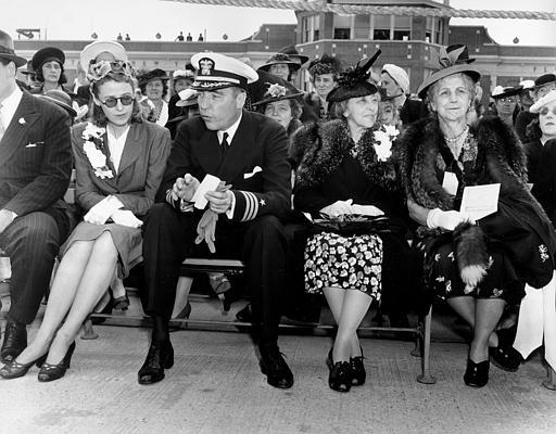 Seated in the first row of the grandstands, Commander Vincent Astor attends the commisioning of Floyd Bennett Field as a U.S. Naval Air Station, in Brooklyn, New York, June 2, 1941. Astor is flanked by his wife Mary "Minnie" Cushing Astor, left, Mrs. Adolphus Andrews, wife of the commandant of the Third Naval District, second from right, and Mrs. Floyd Bennet, right, widow of the naval aviator for whom the field is named. (AP Photo) |