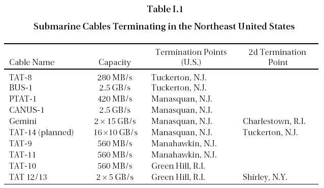 The results of this stacking can be seen in Table I.1. Of 10 cable systems with a total capacity of about 206 gigabytes per second (assuming that TAT 14 begins operations as planned in 2001), six terminate in only one of the same three cities, Tuckerton, Manasquan, and Manahawkin, New Jersey. Onea self-healing loopterminates in both Tuckerton and Manasquan. A sixth terminates in both Manasquan and Charlestown, Rhode Island. Theoretically, an attack on two or three of these sitesat the point where the cables come together in the undersea trench before coming ashorecould cause enormous damage to the entire system. For instance, a successful attack on trenches in Tuckerton and Manasquan and Charlestown would eliminate all but 11 gigabytes per second of carrying capacity in that regiona 95 percent cut.