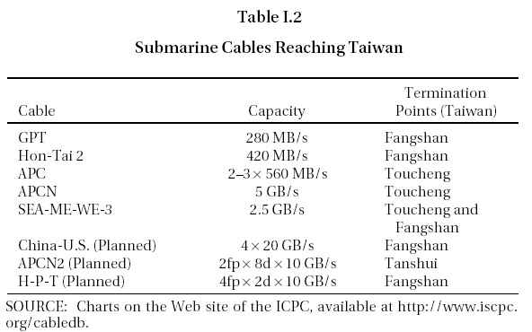 As seen in Table I.2, a recent survey of the number of international submarine cables reaching Taiwan is particularly disconcerting. Four out of five undersea fiber optic cables reaching Taiwan do so at either Fangshan or Toucheng (the fifth, a self-healing loop reaches Taiwan at both, meaning that both cables would have to be damaged for Taiwan to be cut off). Two more planned cables have landing areas at Fangshan. Only one planned cable is due not to land at either Fangshan or Toucheng. In short, Taiwans ability to send and receive data over submarine cables might be significantly impaired by an attack on cables leading into either landing area. A well-orchestrated set of undersea attacks on the cable trenches at both locations might well have a sudden and calamitous effect on Taiwans ability to communicate with the outside world. This information may well have increased relevance in light of Chinas renewed emphasis on information warfare.