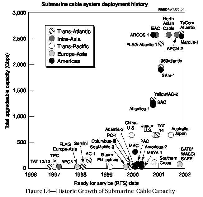Over the past decade, the increased demand for bandwidth driven by the Internet, as well as the continuing international trend of privatization of national telecommunications industries, has outstripped by far the resources offered by satellite transmission of voice and data (Petit, 1999). Instead, the fraction of transoceanic voice and data transmitted over undersea cables has grown in the past 12 years from 2 percent to as high as 80 percent in 2000 (Mandell, 2000). As demand has grown, so have the numbers of cables on the seabed. While experts differ on whether the worlds fiber optic network faces a capacity glut or crunch,1 it is certain that demand for higher bandwidth will continue to grow, and with it, the capacity of cablesthose currently existing and those soon to be laidto grow hand in hand. Due to be completed this year, for instance, is the Southern Cross cable network, offering a quantum leap in carrying capacity in the Southern Pacific (up to 160 gigabytes per second) in a three-tiered ring totaling some 29,000 kilometers. Similarly advanced systems are due to come on-line in the North Atlantic as well, increasing the total transatlantic carrying capacity to more than 1,000 gigabytes per second, enough capacity for the contents of 200 compact discs to be transmitted every second (McClelland, 2000).
