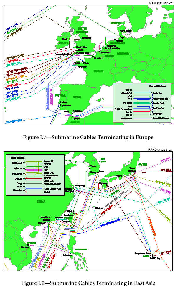 Given the above, however, it is clear that more attention should be paid to the potential for deliberate attacks on the global fiber optic cable network (see figures I.7 and I.8 for a look at some of the cables terminating in Asia and Europe). Currently, for instance, shore authorities have positioned radars and occasionally scheduled flyovers for areas in New Jersey that might be targeted (Chave, 2000).