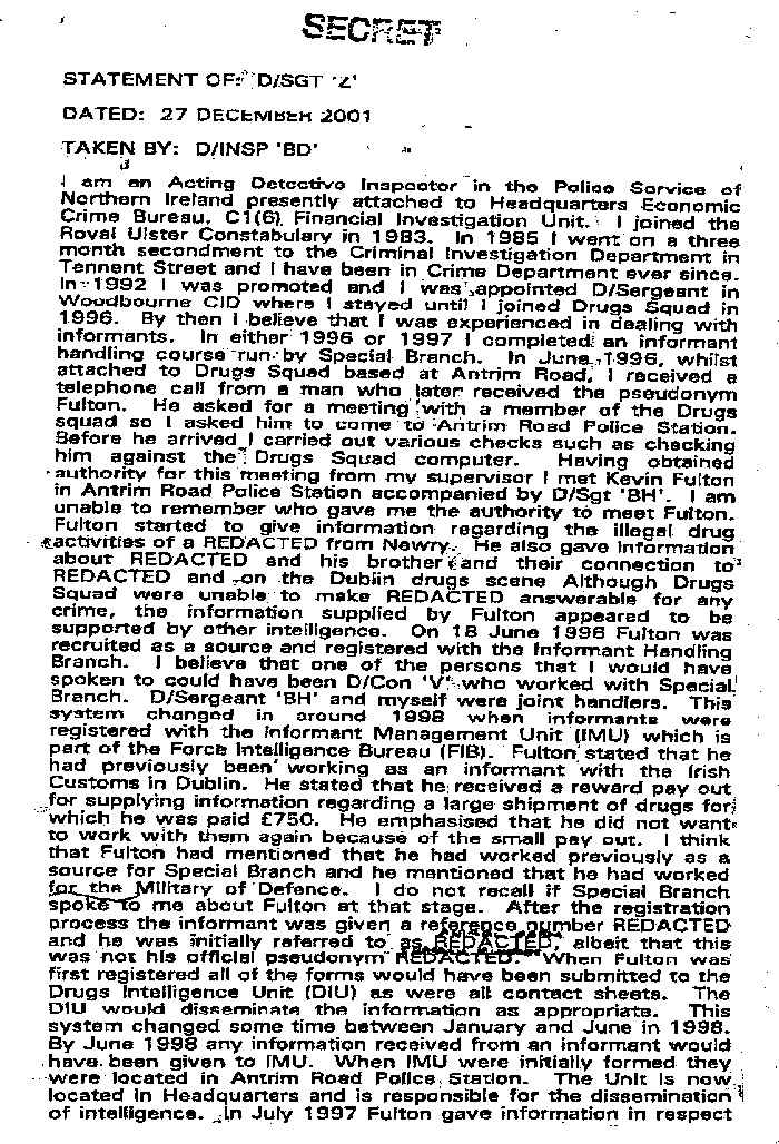 In June 1996, whilst attached to Drugs Squad based at Antrim Road, I received a telephone call from a man who later received the pseudonym Fulton. He asked for a meeting with a member of the Drugs Squad so I asked him to come to Antrim Road Police Station. Before he arrived I carried out various checks such as checking him against the Drugs Squad computer.