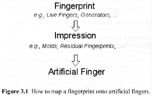 There are several major ways to make an artificial finger of a given live finger, as shown in Fig. 3.1. First of all, an impression must be obtained from the live finger. The fingerprint image of the impression is mostly the lateral reversal, i.e., transposed from left to right as in a mirror reflection, of the original. This impression may be used as an artificial finger to deceive the system, if an attacker can make an impression without being lateral reversal. However, most of the impressions have a lateral reversal fingerprint image. When a live finger was pressed on an impression material, a fingerprint image on the impression may be used as a mold of an artificial finger. If an impression was captured with a digital camera as an electronic fingerprint image, it may be set right side left by an image processing software, and then printed on a material to make an artificial finger. This electronic fingerprint image also can be used to make a mold, as it is. The impression may be a residual or inked fingerprint. Even if the fingerprint image is latent, some techniques for scientific crime detection can enhance it with some material, e.g. aluminum powder, a ninhydrin solution, a cyanoacrylate adhesive,6, 18 then producing the artificial finger with them. Besides these, we can, without original live fingers, create an artificial finger with a fictitious fingerprint, such as, using a so-called fingerprint generator.