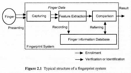 The principle of fingerprint systems is schematically illustrated in Fig. 2.1. In an enrollment process, the system captures finger data from an enrollee with sensing devices, extracts features from the finger data, and then record them as template with a personal information, e.g. a personal identification number (PIN), of the enrollee into a database. We are using the word "finger data" to mean not only features of the fingerprint but also other features of the finger, such as "live and well" features. In an identification (or verification) process, the system captures finger data from a finger with sensing devices, extracts features, identifies (or verifies) the features by comparing with templates in the database, and then outputs a result as "Acceptance" only when the features correspond to one of the templates.