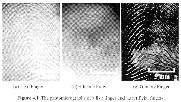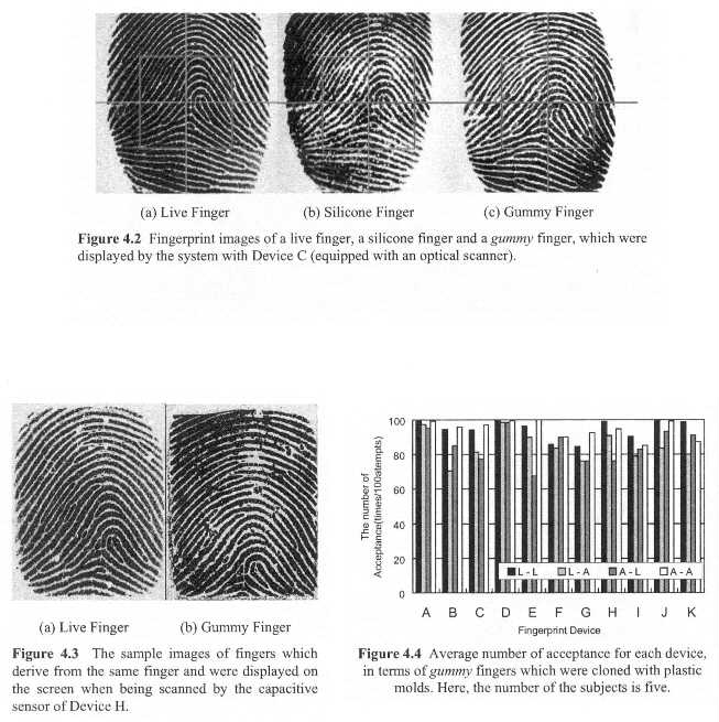 T. Matsumoto, H. Matsumoto, K. Yamada, S. Hoshino, "Impact of Artificial Gummy Fingers on Fingerprint Systems," Proceedings of SPIE Vol. #4677, Optical Security and Counterfeit Deterrence Techniques IV, 2002.