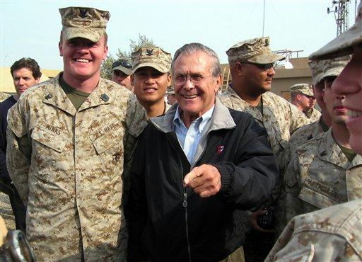 U.S. Defense Secretary Donald H. Rumsfeld, on a surprise Christmas Eve stands with troops in their base in Fallujah, Iraq, Friday Dec. 24 2004. (AP Photo/Nick Wadhams) |