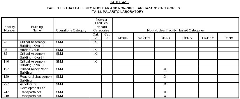 Table 4-3 identifies the facilities in TA-3 that fall into a facility hazard category because of the type of operations performed in the facility.