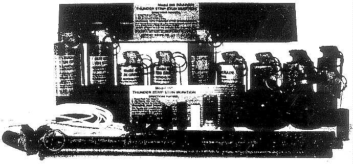 In addition to evaluating both the basic safety of the design (submunition ejecting or non-submunition ejecting) and the power level (STUN or DIVERSION/DISTRACTION) of the SPLLAT Munition to be selected, the user should also be aware that there are several other very interesting and tactically useful designs of SPLLAT Munitions available on today's market. These include Thunder Rods, which are, as the name implies, long, rod-like Munitions that are designed to be inserted through a small hole through a door or wall. These holes are usually made by using a 12 gauge shotgun with a frangible slug, such as the SHOK LOCK made by Precision Ordnance Products. Thunder Strips (these are nominally foot-long strips of thin, corrugated plastic which are filled with explosive and fired by means of a remote fuze assembly attached to a short length of flexible, hollow plastic Flashtube), which are designed to be inserted under a closed and locked door in order to produce an incapacitating, stunning blast inside the otherwise secure room. There are also Launchable Stun Grenades, which, while physically similar to Thunder Rods, are made with a special Plastic Obturating Cup on one end. In practice, the obturating cup end is inserted into a 12 gauge riot shotgun's muzzle, the safety lever secured by means of either a Shok Lock Adapter or a rubber safety-lever retaining device, the Safety Pin removed, and the M444 is then fired by means of a special M444 Launching Blank. The range of these launchable grenades is approximately 75 meters, and they are a lot more accurate than regular hand thrown grenades. They can even be fired through most standard glass window panes. While not of "Match Grade Accuracy" they are certainly a lot more accurate (as well as longer ranged) than any hand thrown grenade.