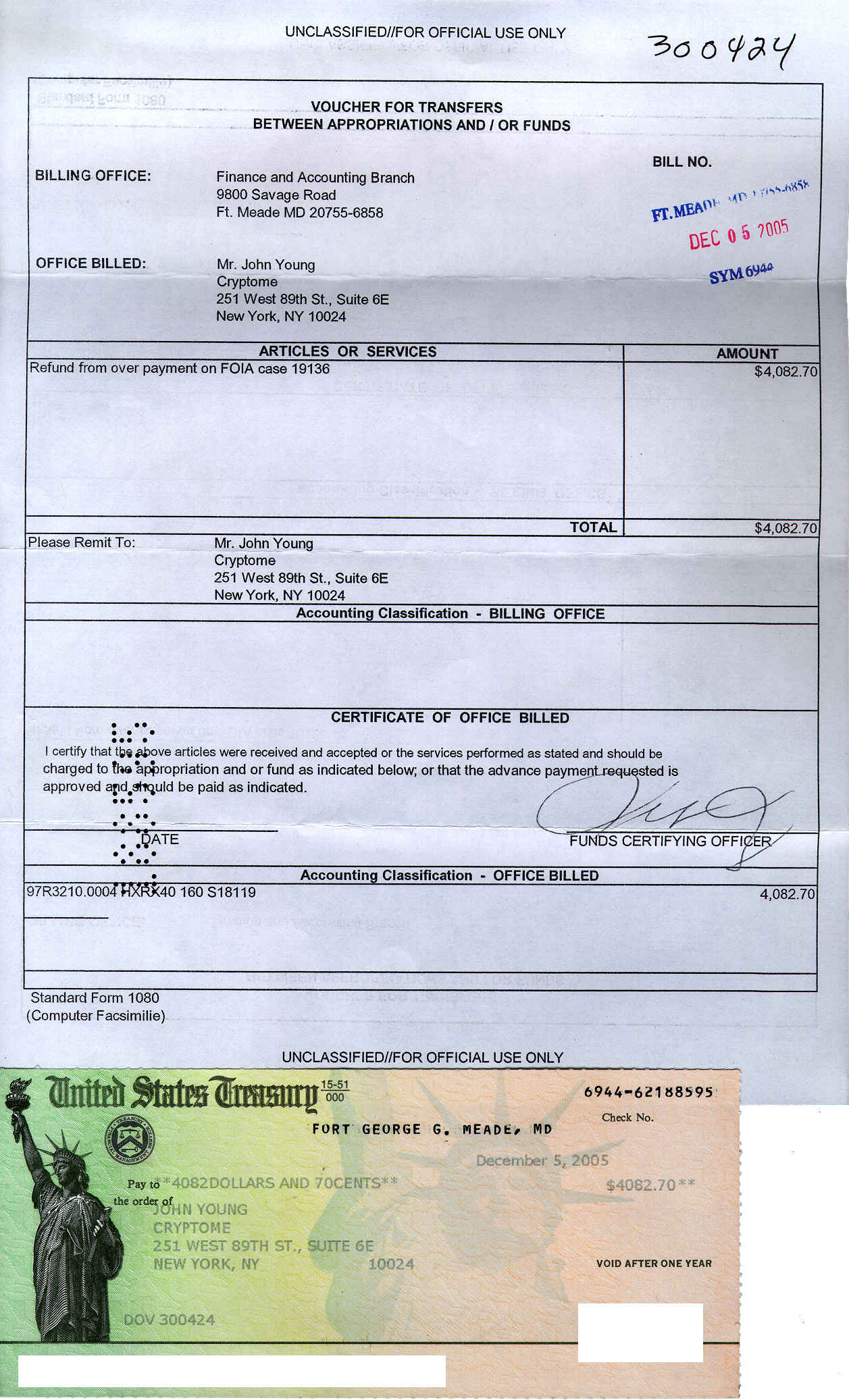 NSA FOIA Office: "We have calculated the actual costs that were incurred by the various Agency organizations that searched for information responsive to your request and determined that the actual costs were significantly less than the estimate. You will be sent a refund of $4082.70 under separate cover."