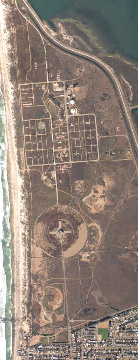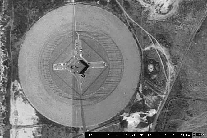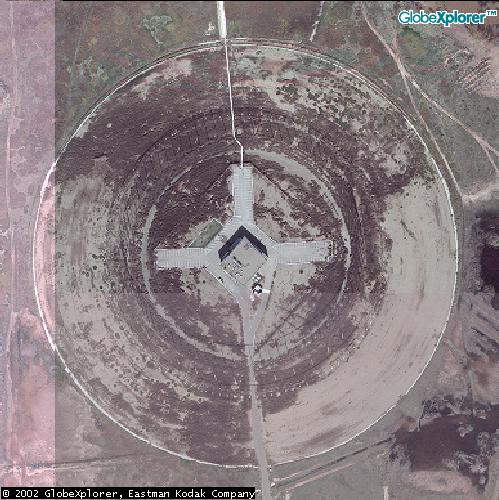 ![]() ![]() For scale of the Wullenberg antenna, about 250 yards in diameter, the dots in the cross are automobiles parked around a square building. Compare to photo at right which shows, perhaps, a single vehicle. Source: FAS/USGS 1994.