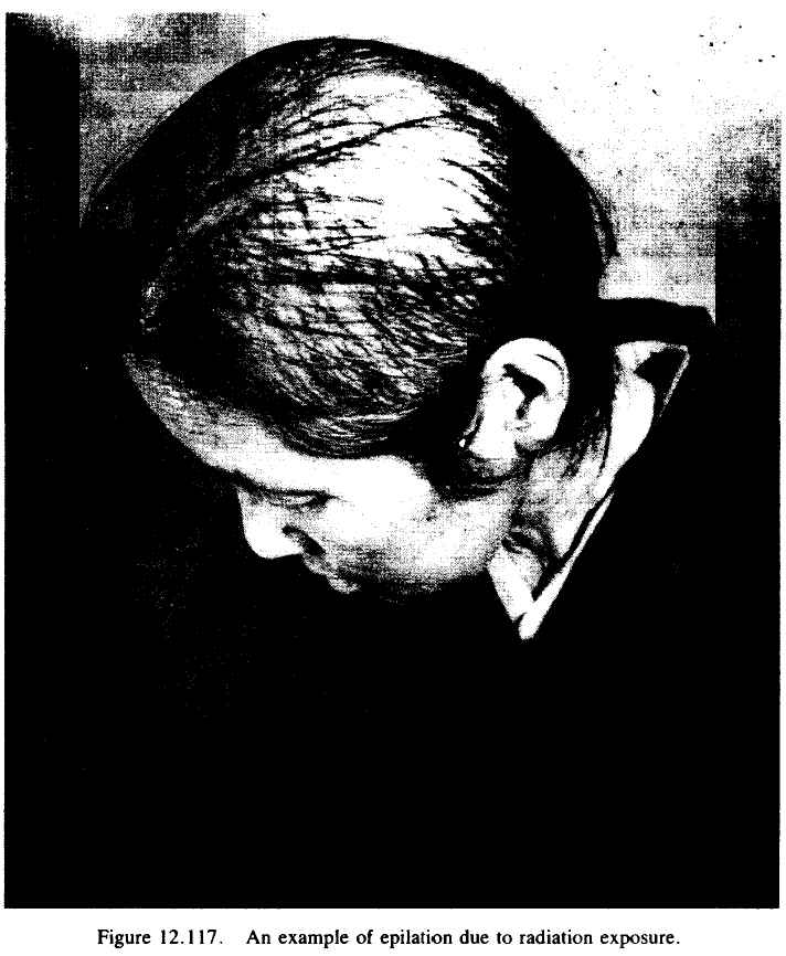 12.234 Epilation was common among exposed Japanese surviving more than 2 weeks after the explosion. The onset of epilation from the head was between the 13th and 14th days after exposure in both sexes. Combing accentuated this change, although copious amounts of hair were lost spontaneously for about 2 weeks. The distribution of the radio-epilation conformed in general with that expected from the senile changes of male ancestors. The hair of the eyebrows, eyelashes, and beard came out much less easily than from the head. In severely exposed but surviving cases, hair began to return within a few months, and epilation was never permanent.