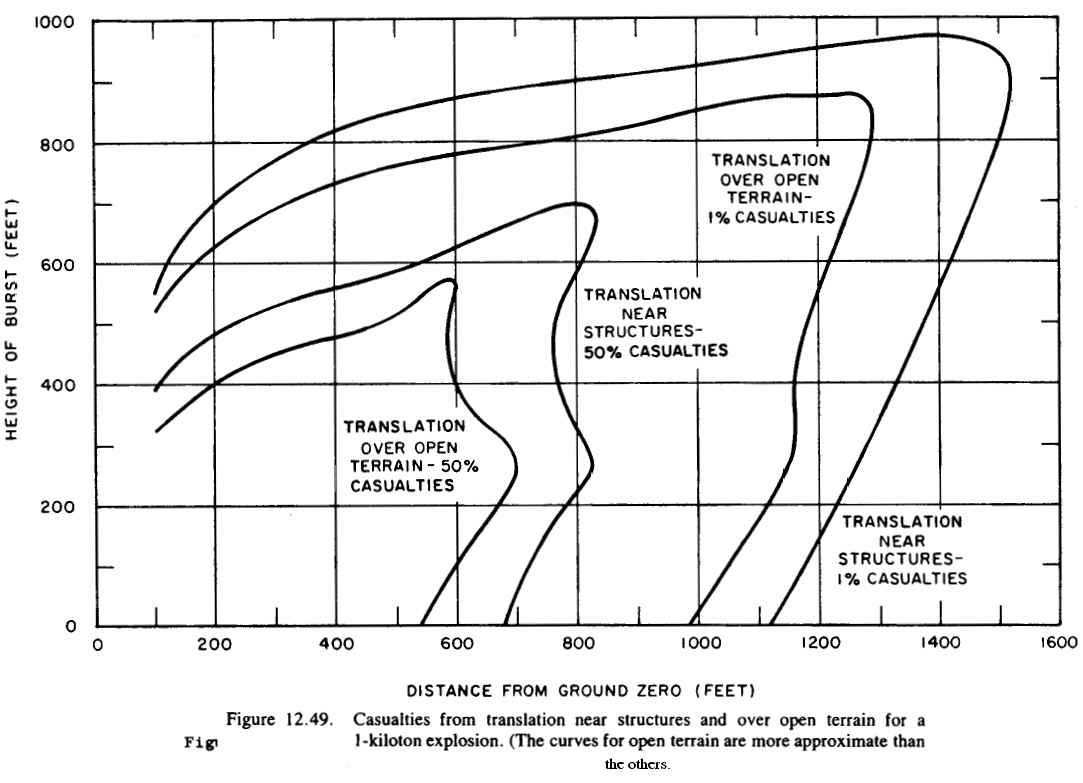 12.04 All other things, including exposure conditions, being the same, the number and distribution of casualties of various kinds for a nuclear explosion of given yield will be determined by the type of burst. Moreover, for an air burst, the height of burst will have an important influence. With other factors constant, there is an optimum height of burst which maximizes the range on the ground for a given overpressure in the blast wave (§ 3.73). This optimum height differs for each yield and for each value of the overpressure. Similarly, there are particular heights of burst, usually different from that for blast damage, which maximize dIe ranges for either thermal radiation or the initial nuclear radiation. It is evident, therefore, that considerable variations are possible both in the number and in the nature of the injuries associated with an air burst.