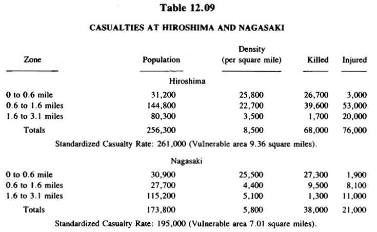 12.12 The data in the table also show that more than 80 percent of the population within 0.6 mile (3170 feet) from ground zero were casualties. In this area the blast wave energy, thermal exposure, and initial nuclear radiation were each sufficient to cause serious injury or death. Beyond about 1.6 miles, however, the chances of survival were very greatly improved. Between 0.6 and 1.6 miles from ground zero a larger proportion of the population would probably have survived if immediate medical attention had been available. Although the particular distances mentioned apply to the yield and conditions of the Japanese explosions, it is to be expected quite generally that close to ground zero the casualty rate will be high, but it will drop sharply beyond a certain distance which scales with the energy yield of the explosion.