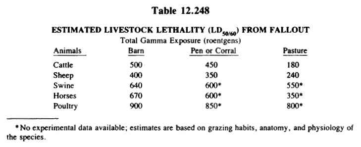 12.248 Observations have been made on animals exposed to wholebody gamma radiation alone (barn) or in combination with skin exposure (pen or corral) or with exposure of the skin and the intestinal tract (pasture) at dose rates of the order of magnitude expected from fallout. From the results, estimates were made of the total gamma exposure which would be fatal to 50 percent of a large group of animals within 60 days (LD50/60); the values are summarized in Table 12.248. It is evident that, for cattle and sheep, which are ruminants, internal exposure can contribute substantially to the lethality of fallout.