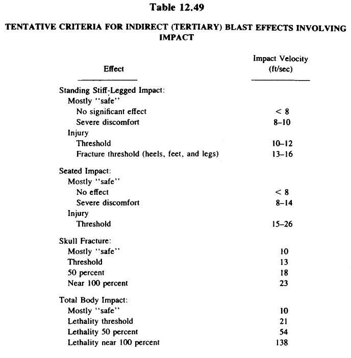 12.25 The general interactions of a human body with a blast wave are somewhat similar to that of a structure as described in Chapter IV. Because of the relatively small size of the body, the diffraction process is quickly over, the body being rapidly engulfed and subjected to severe compression. This continues with decreasing intensity for the duration of the positive phase of the blast wave. At the same time the blast wind exerts a drag force of considerable magnitude which contributes to the displacement hazard.