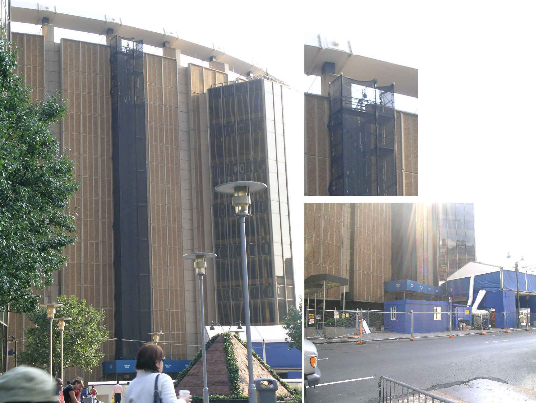I noticed that you have updated the RNC (in)Security page, and I would like to draw your attention to a major vulnerability that is at the site right now that you may not be aware of.On the north side of the building a large amount of scaffolding is going up, essentially it is a 9-story cable ladder that goes from the media vans that will be on the street during the convention, runs parallel but above the sidewalk, and then up the outside of the building, then onto the roof, and down into the media booths in the sky-boxes.