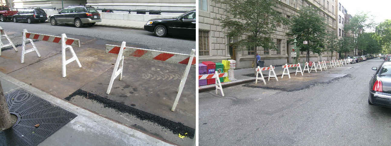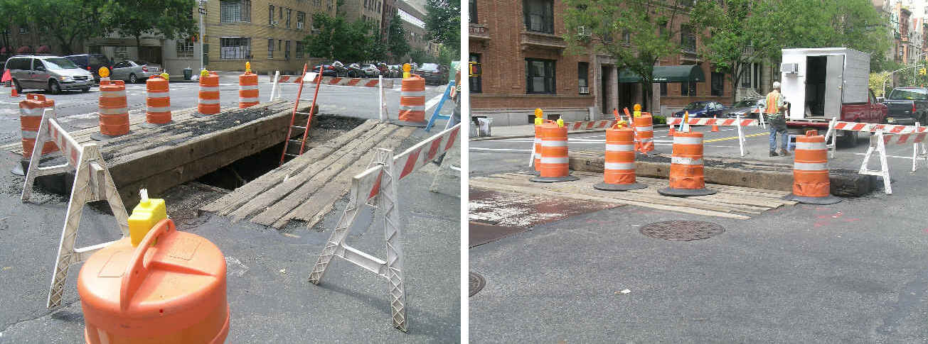 Returning in about an hour, the pit had been covered with steel plates. Several other steel plates nearby appeared to have been in place for some time, indicating that earlier excavations remained open under the plates awaiting completion of work.
