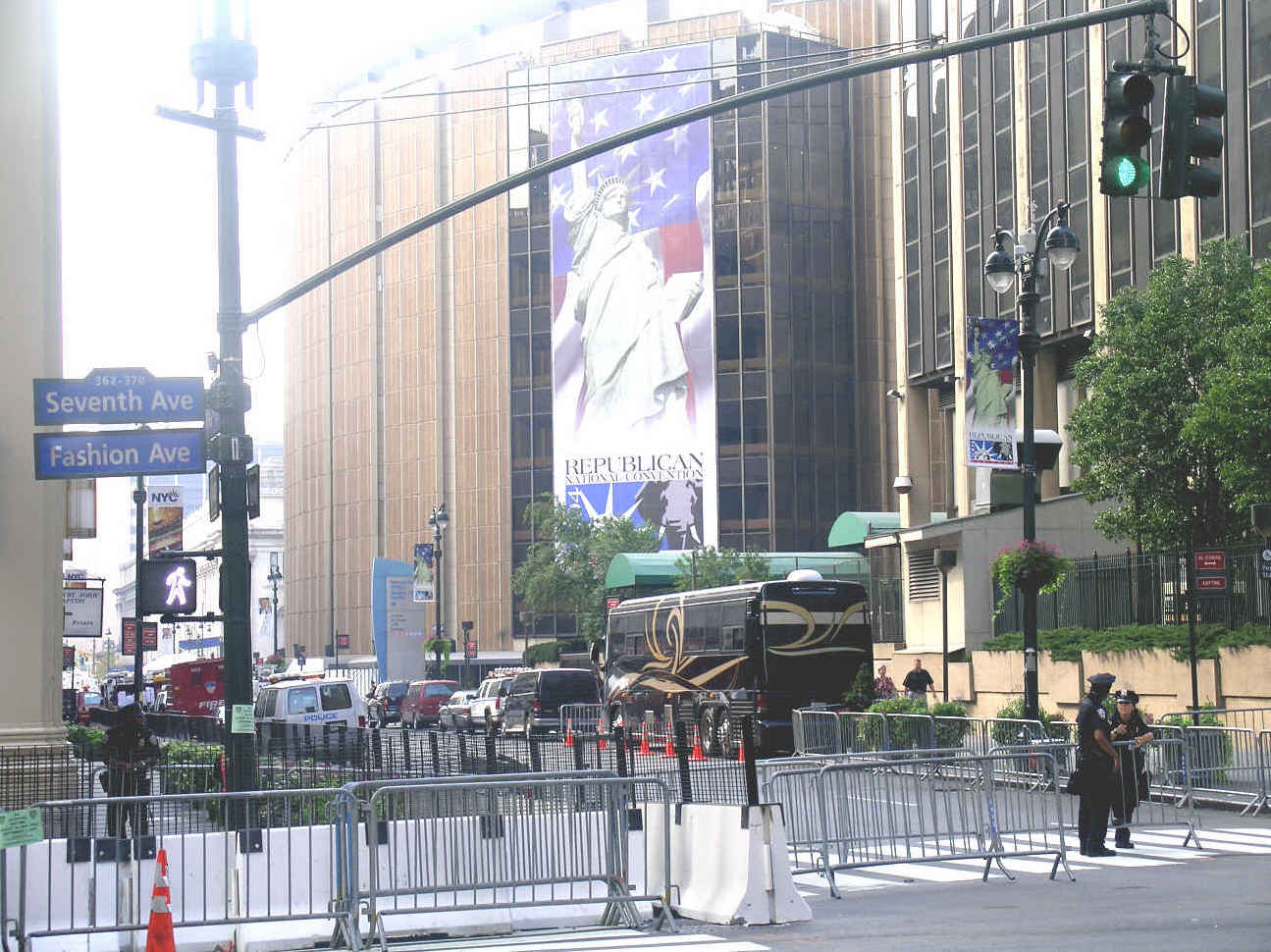 Spanking new concrete barriers were installed -- properly, not like the inept at the DNC -- with more being added as traffic was shut down for the convention. Boston used beat-up historic barricades at the DNC, laid Democratically irregularly, not worried too much about any real attack except by the media. NYC has brought in expensive, newly cast white-concrete barriers, free of grafitti and truck-bashing, as befits a rich, white, law and order GOP hoping to gain greater wealth from their valiant war against terrifying-defense-spending-cut-back. In this gated-community security looked pretty good, the rest of the city can kiss ass goodbye.