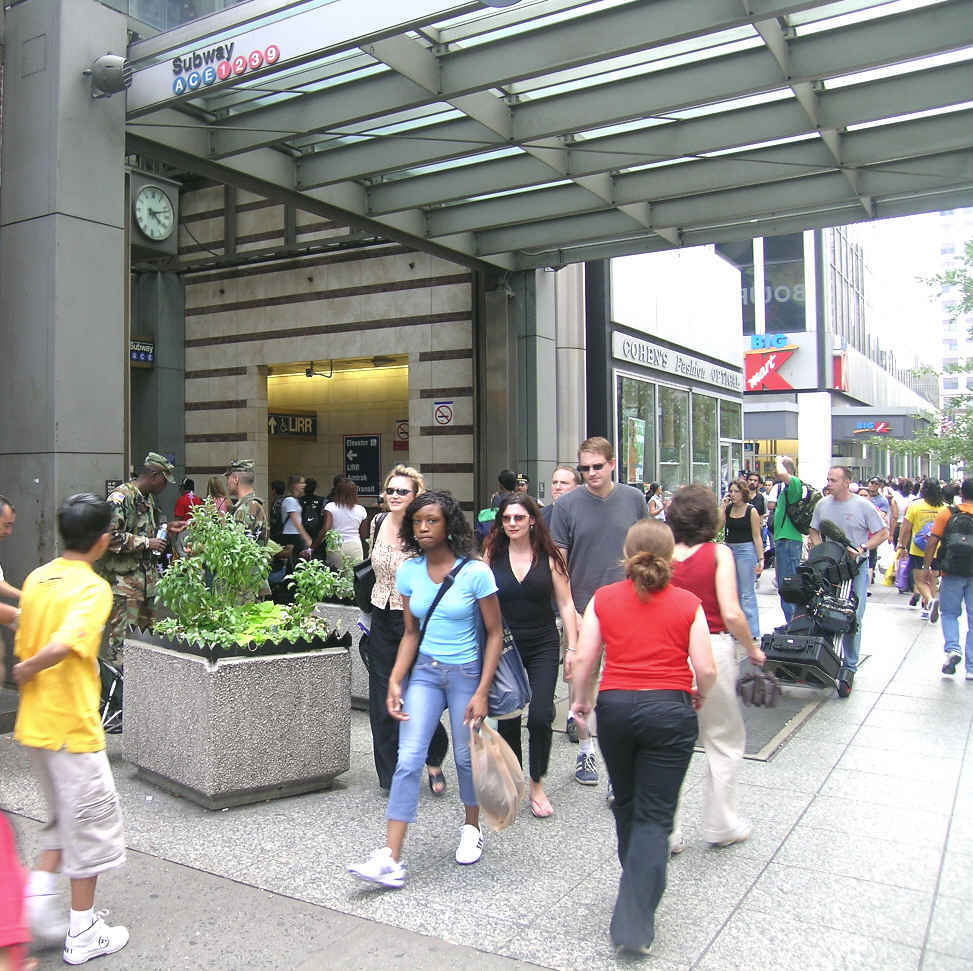 | LIRR Entrance to Penn Station and subways, West 34th Street at 7th Avenue. (Clock betrays time of photo.) |