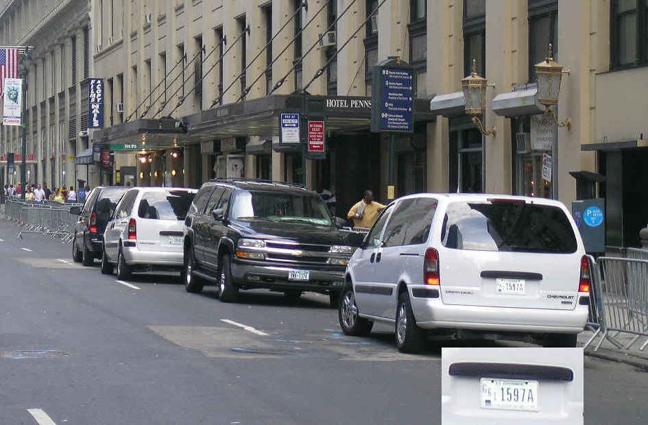 | G-tagged SUVS outside the Pennsylvania Hotel, where the Secret Service/DHS/FBI command center may be located across 7th Avenue from Madison Square Garden. Keep it quiet. This hotel is where hackers held their convention recently and bugs may have been left behind. |