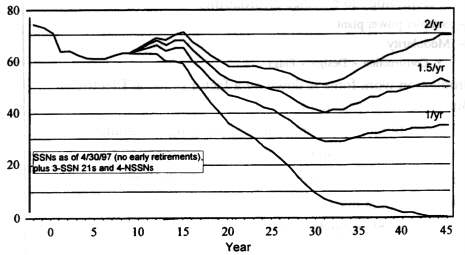 The decision concerning proper SSN construction rate should be reevaluated. It is understandable that when current forces are very effective, continuation of plans to use them into the future is normal. However, the Task Force believes the threat trends discussed previously will reduce the effectiveness of surface ships significantly within 30 years, while leaving the SSN relatively immune to threat escalation. This dynamic change argues that we should have more, non-vulnerable platforms available in the second quarter of the next century, and therefore we should accelerate SSN construction to a rate capable of sustaining current force levels.