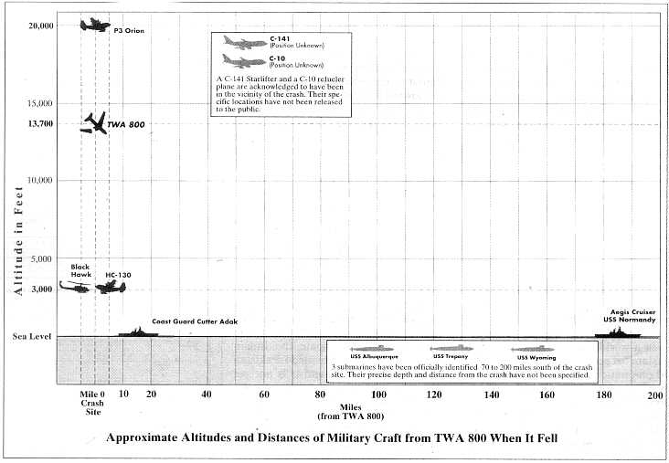 The NTSB graphs of the area during the seconds immediately before and after TWA 800 began its fall show that the nearest planes are USAir 217 and the Navy P3.