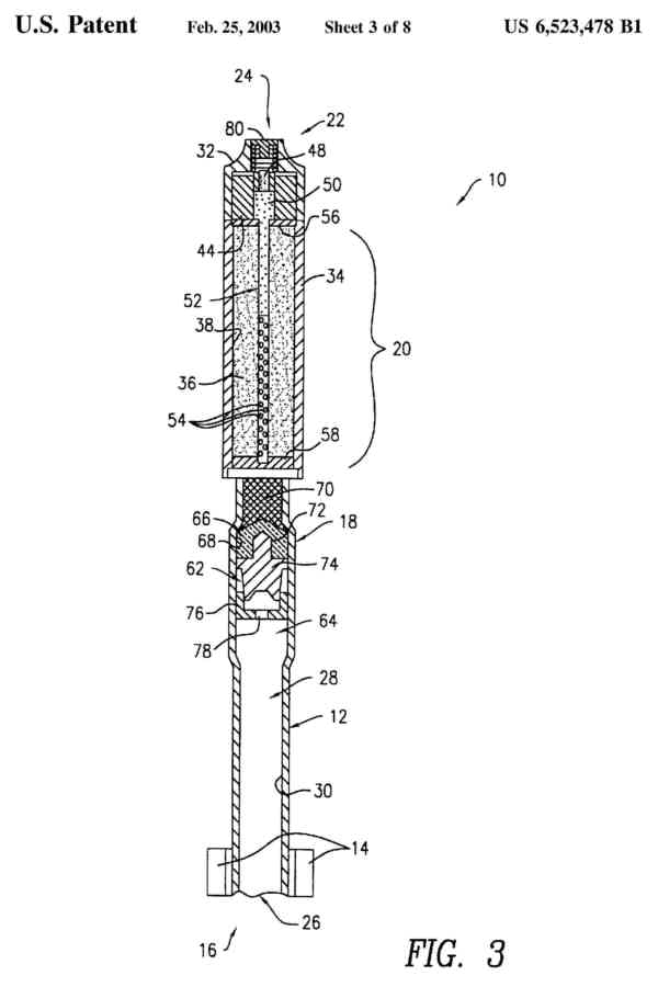 specifically with the anvil 66, a tube 130 containing a primer 48 and a