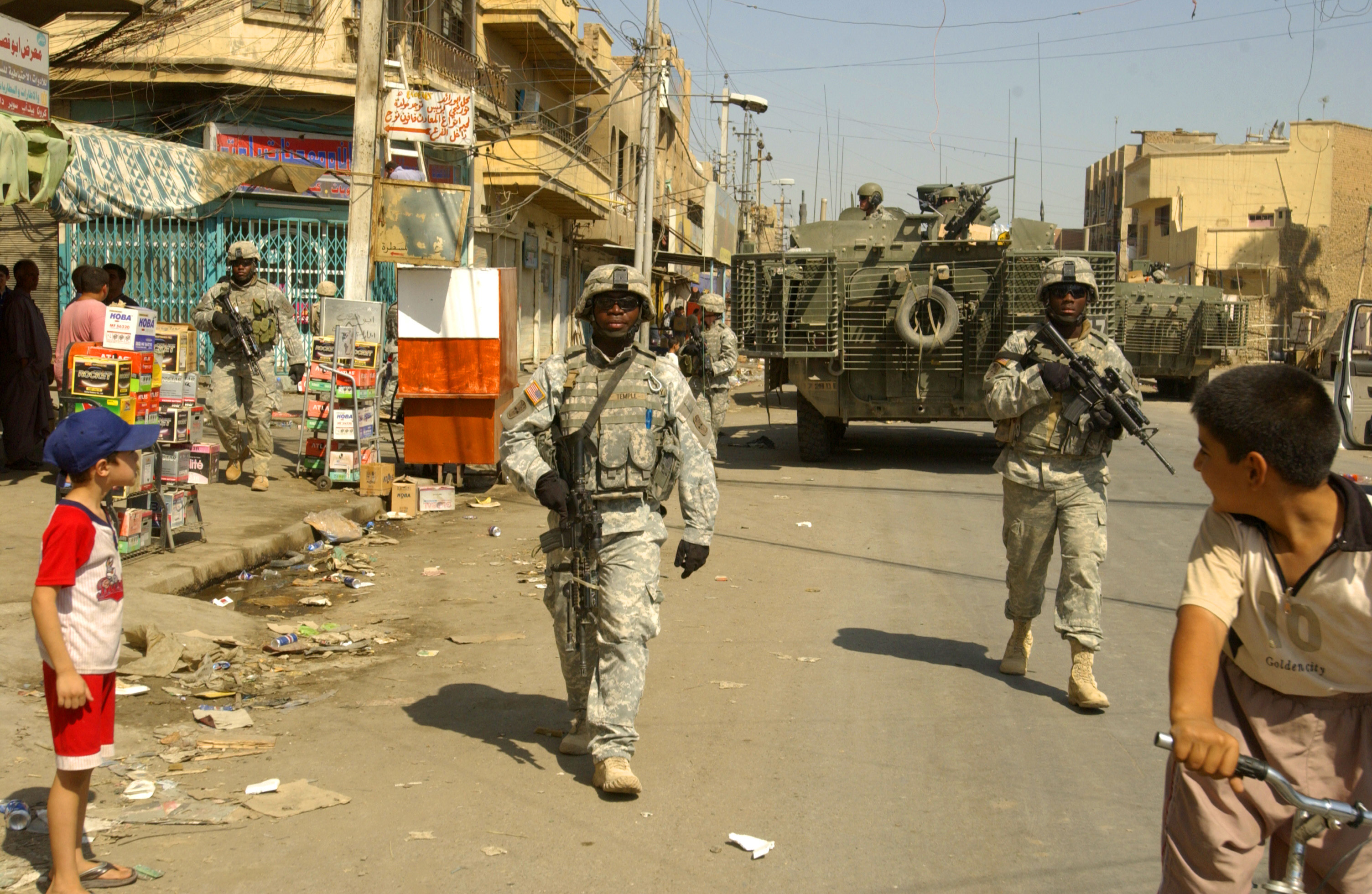 Stryker Brigade Combat Team patrol a street during an operation in Adhamiyah, Iraq, Sept. 1, 2006. DoD photo by Senior Airman Richard Rose, U.S. Air Force. (Released) |