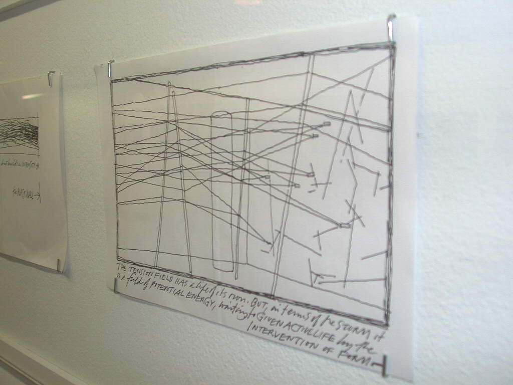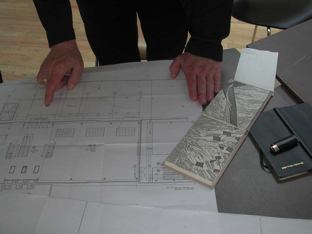 Woods says the Cartier installation is to be constructed by guidance from a large model to be built in the exhibition space, without construction drawings, a process similar to that used in the Cooper Union exhibit in which Woods' rough sketches (sample below) were used by constructors.
