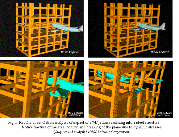 Such data has already been made available to ASCE Building Performance Assessment Team. If those are also available to us, we will be able to proceed further with our research. Figure 5 shows an example of analysis of performance of generic steel high-rise structure subjected to the impact of a 747 jetliner and the ensuing fire. The example demonstrates the power of advanced technology developed in aerospace and mechanical engineering that can be brought to bear on this problem. We plan to use the drawings and the data and the software used in the example to build a computer based realistic model of the World Trade Center towers and analyze their response to simulated impact of the 767 planes that crashed into them on 9/11 and the ensuing fire.