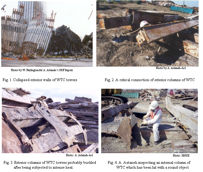 So far, I have made three trips to NYC and spent a total of about 25 days there conducting field investigation and collecting data. Upon arrival to NYC on September 19, and after visiting Ground Zero and paying my respects and prayers to the victims, I started my reconnaissance and collection of the perishable data. I have collected some data on design and construction of the WTC and have met and discussed the case with the structural engineers who have designed the WTC Buildings. Thanks to cooperation of the HSNE recycling plant, I have been able to study the steel from the WTC before recycling. I have identified and saved some components of the structures that appear to have been subjected to intense fire or impact of fast moving objects. Figures 1 through 4 show examples of inspected structures. These critical pieces are saved as perishable data and can be used in future research.
