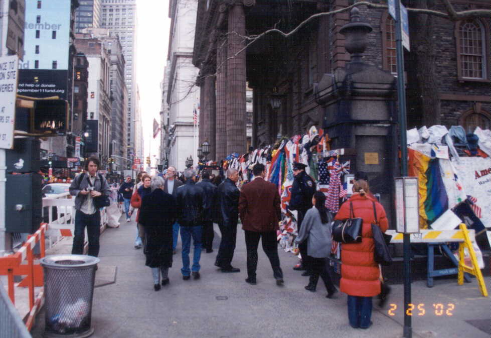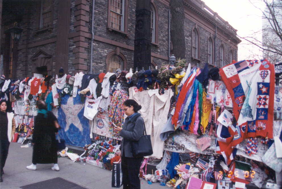Memorials in front of St. Paul's Chapel, on Broadway sidewalk, looking west.